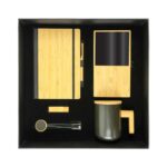 Black Cardboard gift box with cushion inside for product protection and better presentation. The product includes a Bamboo Notebook, Bamboo Pen, Ceramic Mug with Bamboo Lid and handle, Bamboo Wireless charger with Mug Warmer, and Multi-charging cable.