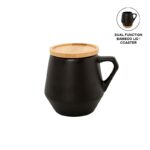 Stylish matt-finish ceramic mug with dual function bamboo lid/coaster. The lid can double up as a coaster for the mug. Dishwasher safe. Capacity: 300ml. Packed in a kraft gift box